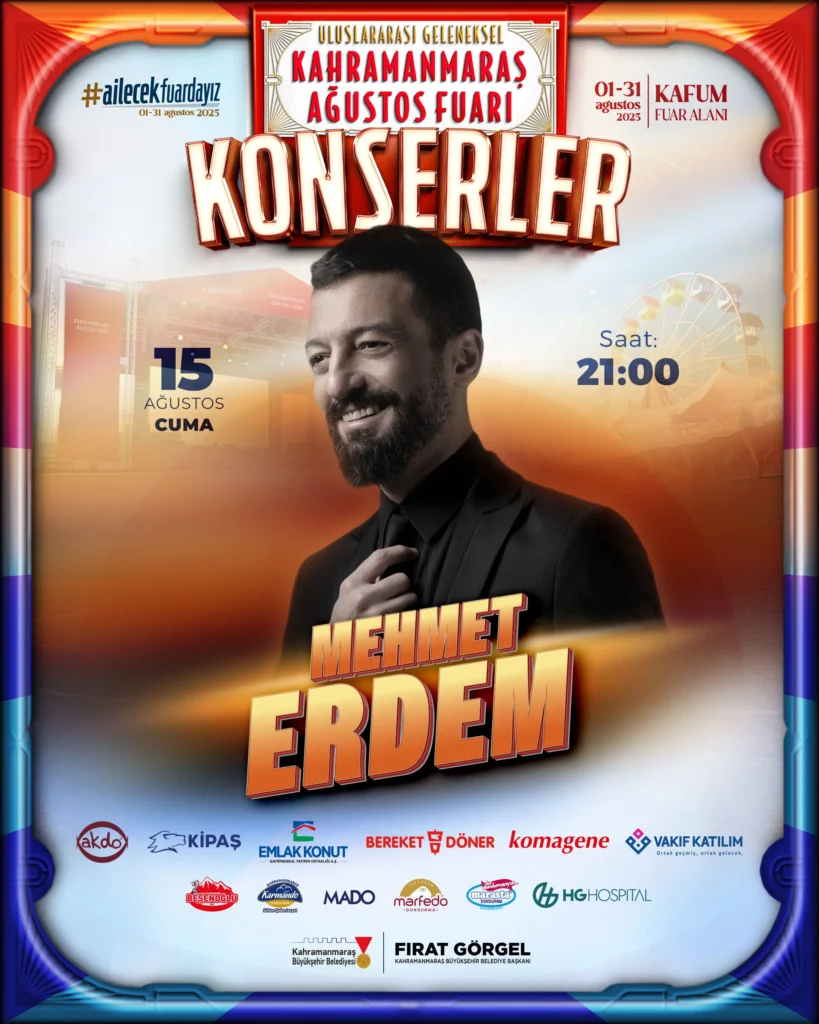 Geleneksel Ağustos Fuarı’nda 15 Ağustos Cuma günü, Türk pop müziğinin sevilen isimlerinden Mehmet Erdem sahne alarak Kahramanmaraşlılarla buluşacak. Saat 21.00’da başlayacak konserde Mehmet Erdem’in eşsiz sesiyle unutulmaz bir akşam yaşanacak.